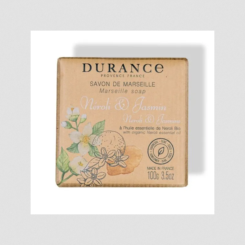 Il sapone solido di Marsiglia al Neroli e Gelsomino contiene olio di cocco, olio d'oliva biologico della Provenza ed estratto di riso biologico della Camargue. Deterge delicatamente e lascia la pelle delicatamente profumata.