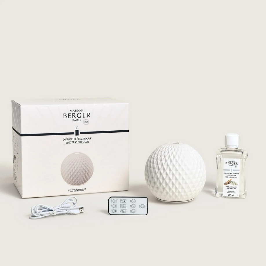 Scopri la morbidezza della forma sferica e la tonalità bianca di questo diffusore elettrico, esaltato dalla fragranza Pure White Tea con note floreali e legnose.